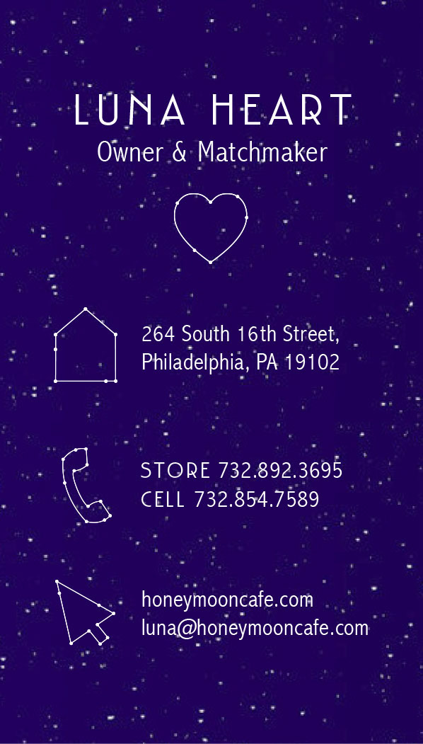 The front and back of a business card I designed for the owner of the Honeymoon Cafe: Luna Heart.